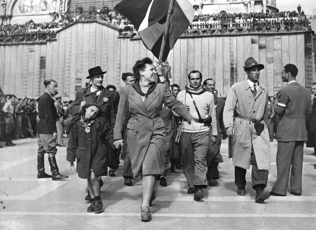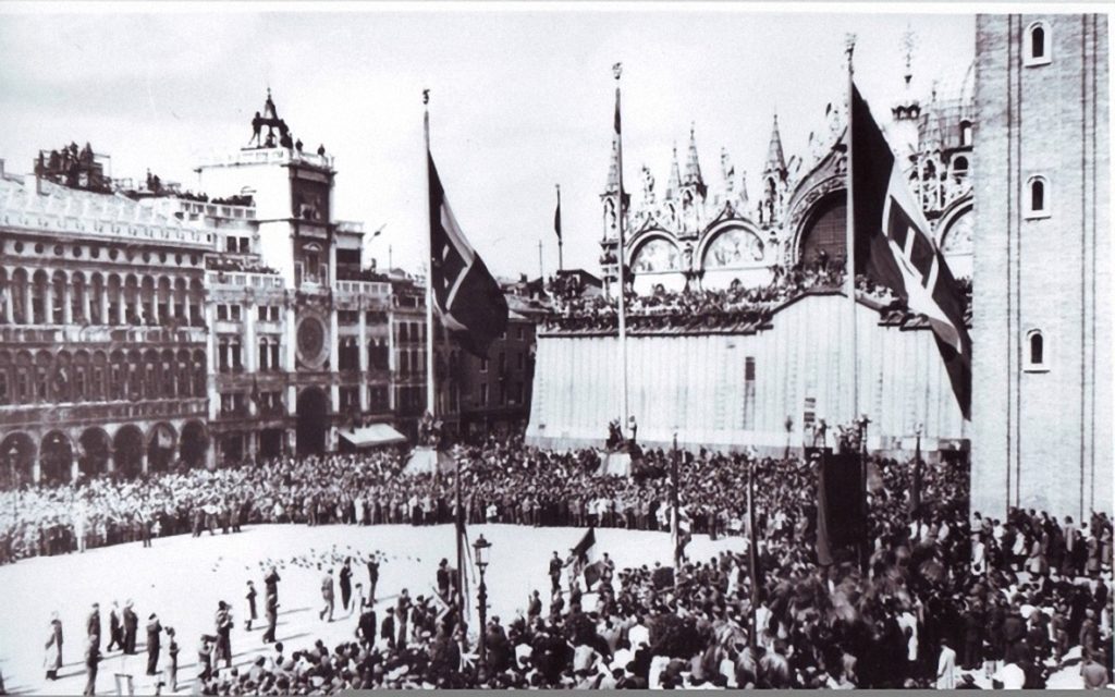 Immagini della festa della liberazione di Venezia, in piazza San Marco, il 1° maggio 1945. Da: Bruno Maida, «La Liberazione nelle grandi città. 1943-1945». Foto di proprietà IVESER – Istituto Veneziano per la Storia della Resistenza e della Società Contemporanea, tutti i diritti riservati.